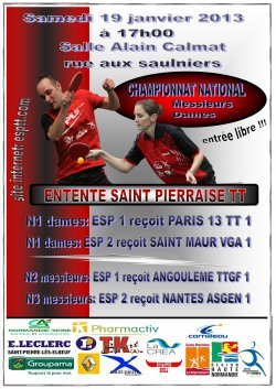 Pour cette première en 2013, 4 équipes évolueront à domicile en opposition la N3 dames et la prénationale masculine se déplaceront en ce samedi 19 janvier 2013 à partir de 17 heures. Entrée libre buvette et programmes.