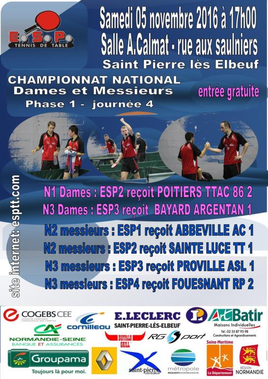 Le samedi 05/11/2016 le championnat national phase 1 2016/2017 reprend à domicile pour cette 4ème journée. A partir de 17 heures dans le gymnase Alain Calmat rue aux Saulniers entrée libre, spectacle assuré.