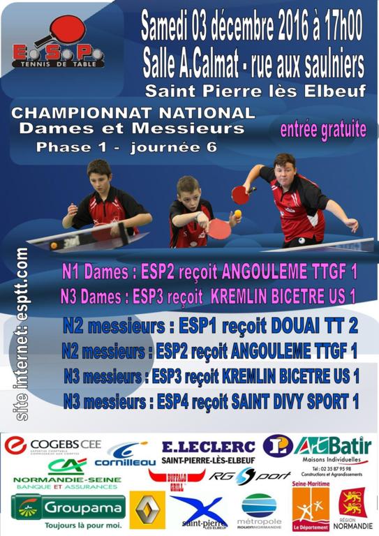 Le samedi 03/12/2016 le championnat national phase 1 2016/2017 reprend à domicile pour cette 6ème et avant dernière journée. A partir de 17 heures dans le gymnase Alain Calmat rue aux Saulniers entrée libre, spectacle assuré.